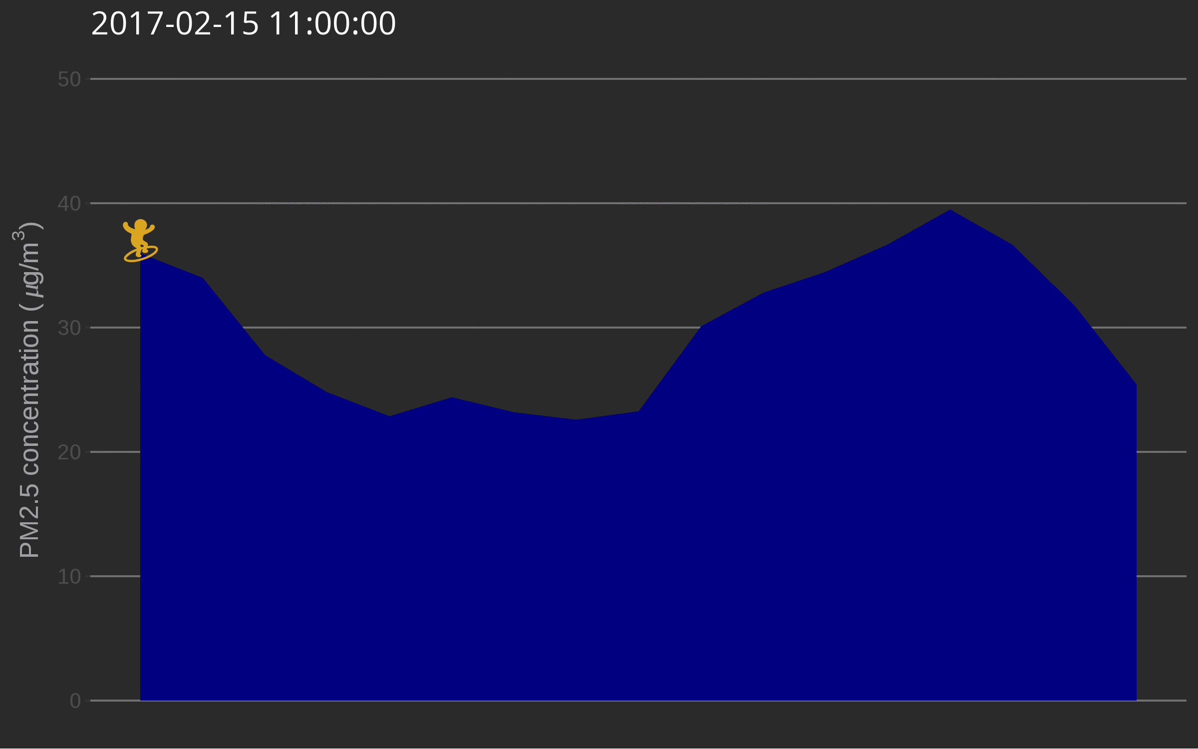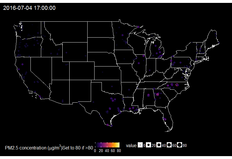 On this gif, where the title indicates the time in New York City, one sees the East to West wave of PM2.5 peaks due to fireworks as soon as it gets dark in each city, which happens at different times across the US. I think it’s an interesting way of looking at this holiday. Holidays and fireworks are one thing, but one could also imagine coupling ropenaq
