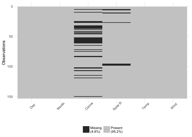 is a very worthwhile project and have already started using it in my own work.”, and “Having now put it to use in a few of my own projects, I can confidently say that it is an incredibly useful early step in the data analysis workflow. vis_miss()