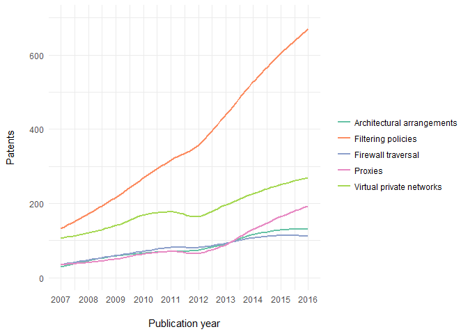 filter(cpc_subgroup_id != "H04L63/02") %>% # remove patents categorized into only top-level category of H04L63/02