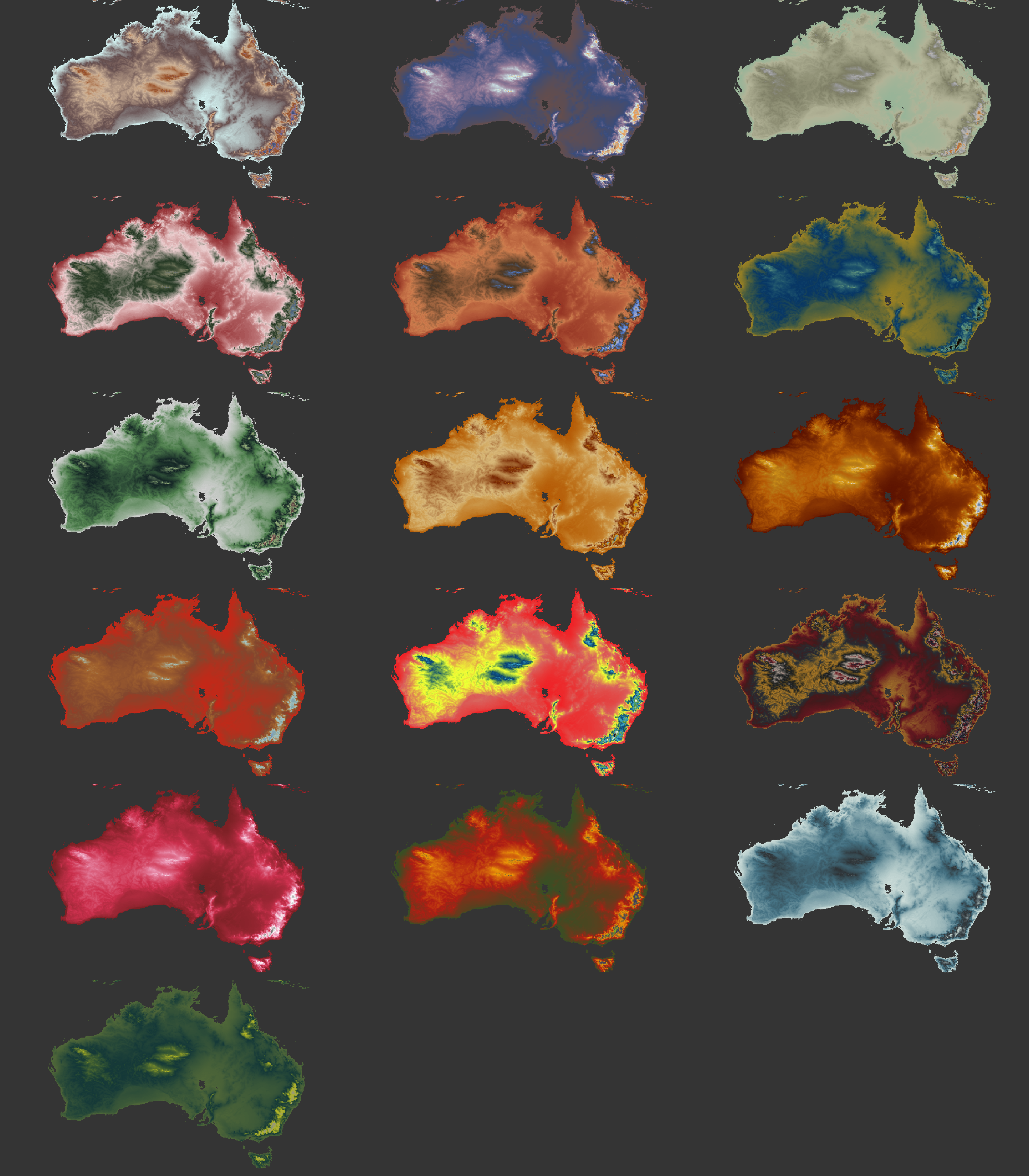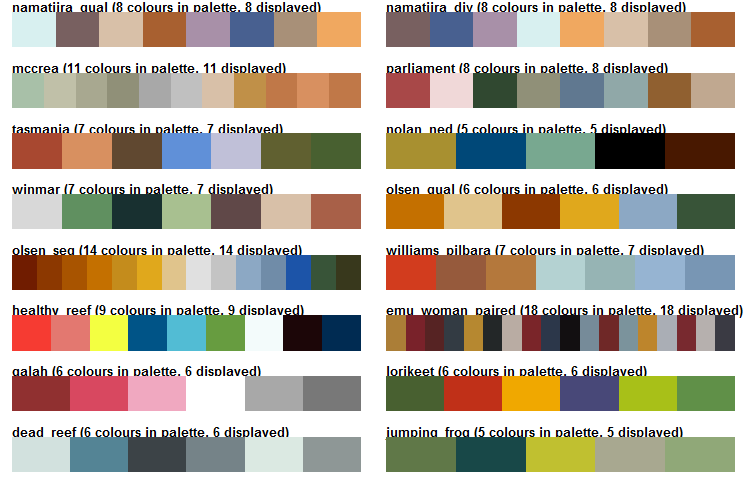 Our package currently contains 16 colour palettes, each one inspired by either an Australian landscape, an artwork or image by an Australian artist, or an Australian animal. Some of the palettes are more suited to displaying continuous data (such as in the Australian elevation maps above). Other palettes will perform best plotting discrete data (as in the parliament