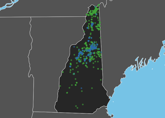 Bicknell’s Thrush is a high elevation breeder and, as expected, observations of this species are restricted to the White Mountains in the North-central part of the state. In constrast, Swainson’s Thrush occurs more widely throughout the state.