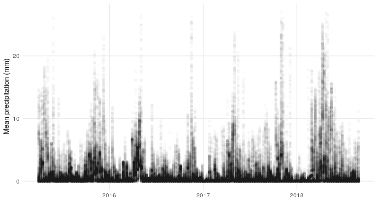 Here the soil moisture and precipitation values are mapped over time, with line plots below to show the median value (black line), interquartile range (dark grey ribbon), 10% and 90% quantiles (light grey ribbon). The exceptional nature of the flooding in 2018 shows up as a high and broad peak in soil moisture and precipitation, and the drought that preceded the flooding in 2017 is visible as a period of low rains and dry soil.