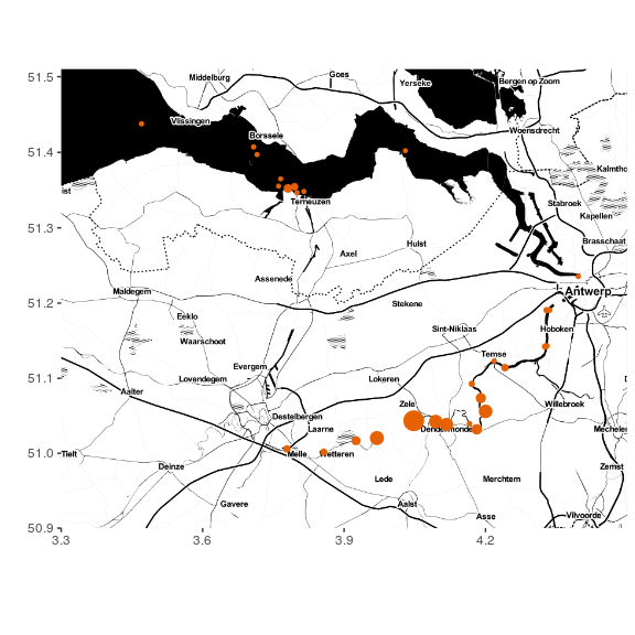 Princess Buttercup’s signal was picked up by receivers in Merelbeke (near Ghent) shortly after she was captured and released there on October 11. She resided in a 40 km stretch of the river (between Wetteren and Sint-Amands) for about a month before migrating towards the sea and starting the long journey towards the Sargasso Sea. The periodic movement pattern up and down the river during the second half of November is of particular interest: it looks like tidal frequency 2. It would be interesting to compare the movement pattern with real water level data from the Scheldt river… which is where our wateRinfo